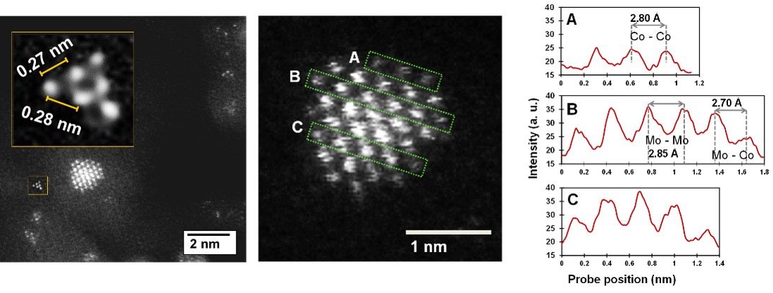 Sur les catalyseurs promus NiW et CoMo, la microscopie electronique montre que l’addition de CA diminue la taille des feuillets de TMS et conduit aussi à la création de petits clusters (<1 nm). L’analyse de particules isolées par HR STEM HAADF permet d’identifier la nature des atomes du bord du feuillet de TMS. Ainsi la microscopie et l’IR/CO mettent en évidence que au sein d’un même feuillet sulfure peuvent coexister des bords totalement promus, et partiellement promus.